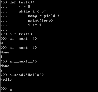 ——换句话说,就是send可以强行修改上一个yield表达式值。比如函数中有一个yield赋值,a = yield 5,第一次迭代到这里会返回5,a还没有赋值。第二次迭代时,使用.send(10),那么,就是强行修改yield 5表达式的值为10,本来是5的,那么a=10