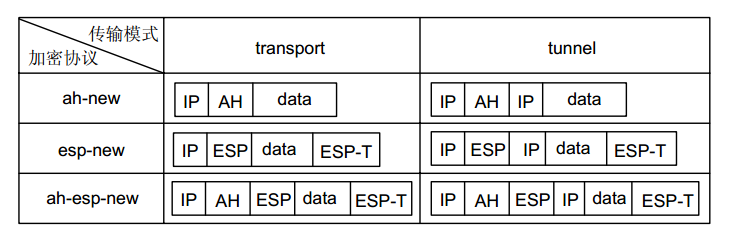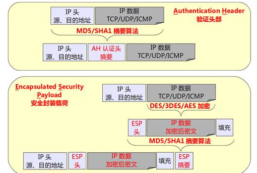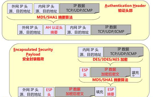 1. AH协议(Authentication Header,使用较少):可以同时提供数据完整性确认、数据来源确认、防重放等安全特性;AH常用摘要算法(单向Hash函数)MD5和SHA1实现该特性。