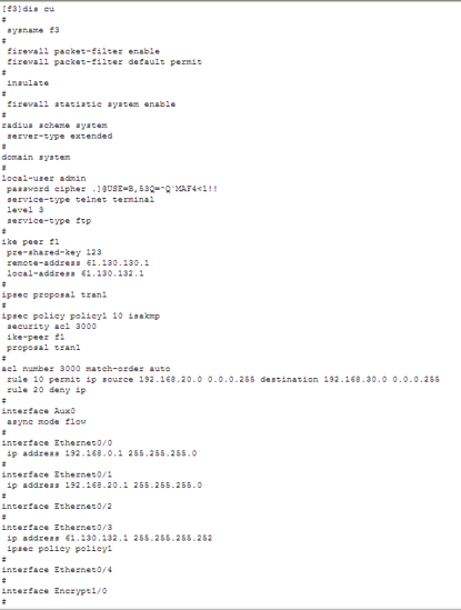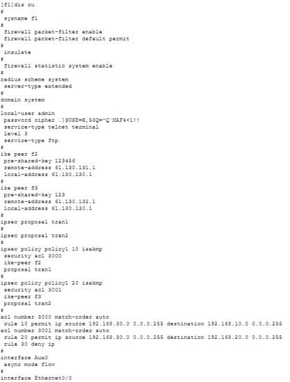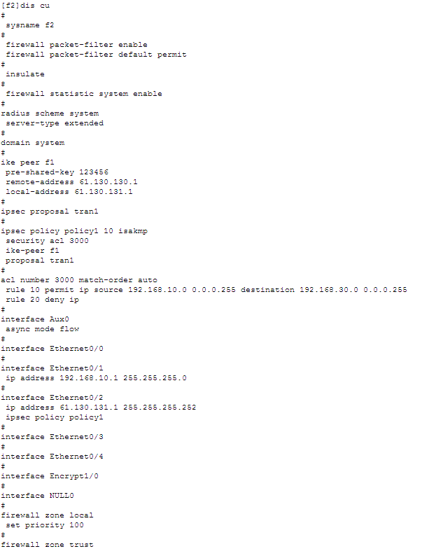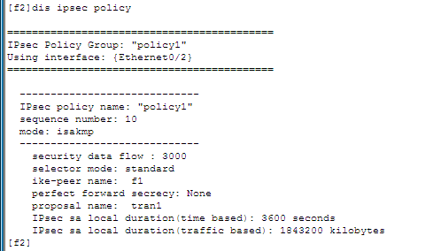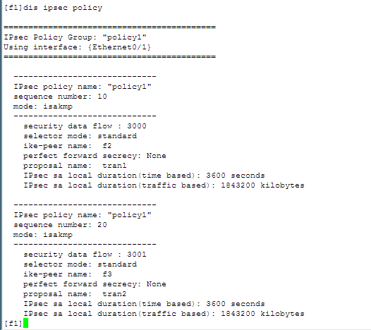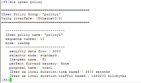 2) 安全策略:由用户手工配置,规定对什么样的数据流采用什么样的安全措施。对数据流的定义是通过在一个访问控制列表中配置多条规则来实现,在安全策略中引用这个访问控制列表来确定需要进行保护的数据流。一条安全策略由“名字”和“顺序号”共同唯一确定。
