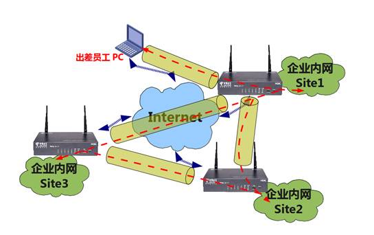 1. Site-to-Site(站点到站点或者网关到网关):如弯曲评论的3个机构分布在互联网的3个不同的地方,各使用一个商务领航网关相互建立×××隧道,企业内网(若干PC)之间的数据通过这些网关建立的IPSec隧道实现安全互联。