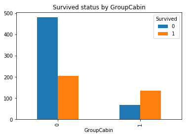 #将没有舱位的归为0, 有舱位归为1. train['GroupCabin'] = np.where(train.Cabin == 'NO', 0, 1) #绘制柱形图 GroupCabin_Survived = pd.crosstab(train['GroupCabin'], train['Survived']) GroupCabin_Survived.plot(kind = 'bar') plt.title('Survived status by GroupCabin')