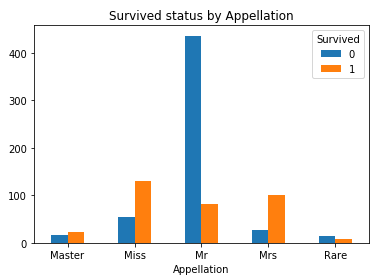 plt.xticks(np.arange(len(Appellation_Survived.index)), Appellation_Survived.index, rotation = 360) plt.title('Survived status by Appellation')