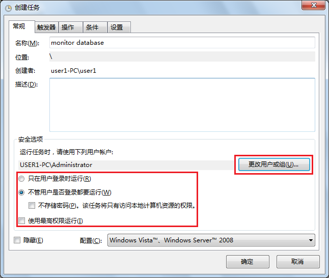 输入任务的名称,并设定使用哪个帐户运行该任务。如要需要“以管理员身份运行”,则请勾选“使用最高权限运行”选项。