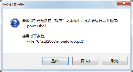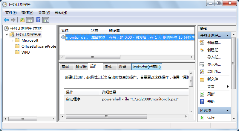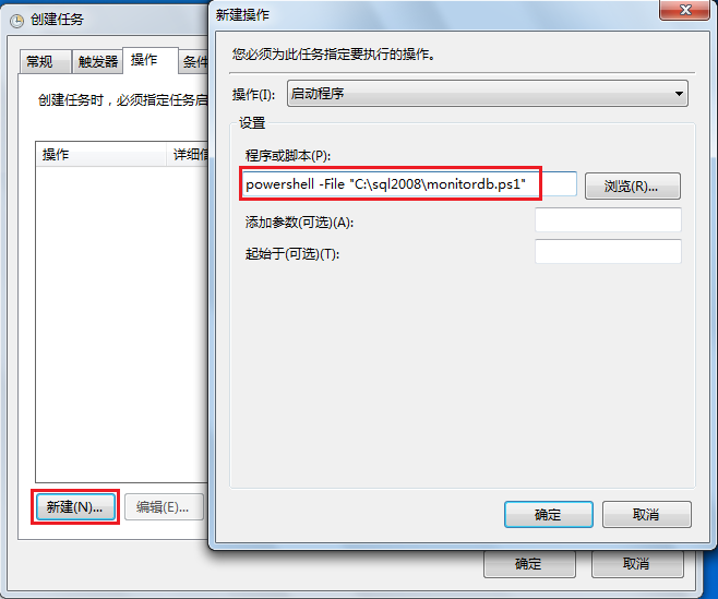 新建一个操作。例如: powershell -File "C:\sql2008\monitordb.ps1" 。