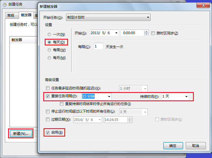 新建一个触发器,设置为每隔15分钟运行一次。