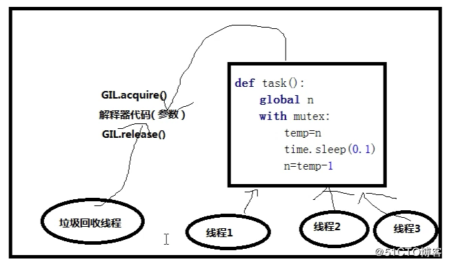 就是加锁处理,如下图的GIL,保证python解释器同一时间只能执行一个任务的代码