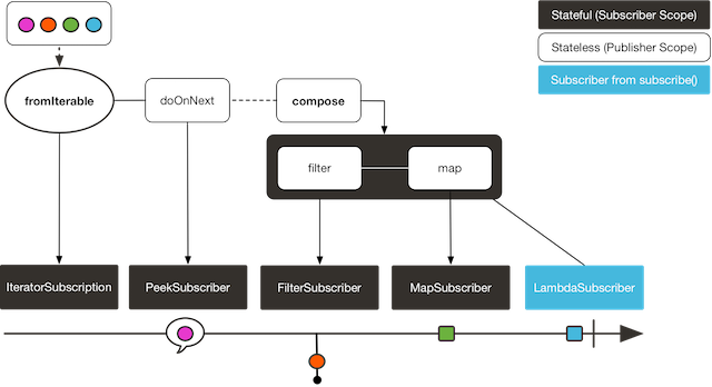 compose 操作符与 transform 类似,也能够将几个操作符封装到一个函数式中。主要的区别就是,这个函数式是针对每一个订阅者起作用的。这意味着它对每一个 subscription 可以生成不同的操作链。举个例子: