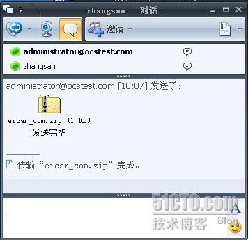 我们在域控制器上用管理员的身份登陆OCS客户端,在OCS服务器上用zhangsan的身份登陆OCS客户端,如下图登陆成功后,我们让管理员给zhangsan发一个病毒文件,来测测试一下Forefront For OCS服务器工作是否正常,右击zhangsan,选择“发送文件”