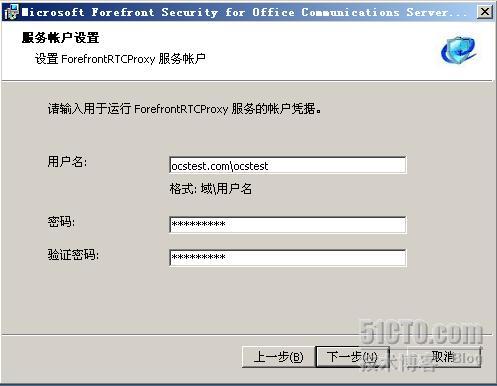 输入运行Forefront For OCS服务的用户名以及口令