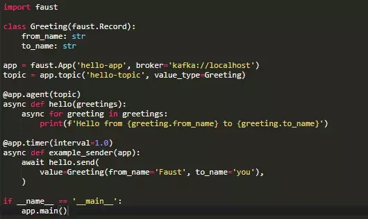 Faust就是Python,而流是一个无限的异步迭代器。如果您知道如何使用Python,那么您已经知道如何使用Faust,它可以与您喜欢的Python库一起使用,比如Django、Flask、SQLAlchemy、NTLK、NumPy、Scikit、TensorFlow等等。