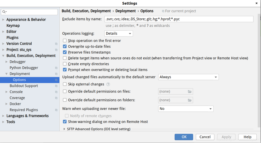 配置代码同步,File的Settings的Deployment,填上ip,端口号,用户名,密码,然后Test Connection连接测试,成功后选择Root path:远程项目的文件夹(或者把Mappings的Deployment path的地址剪切过来)