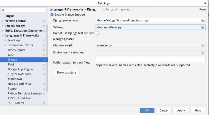把Enable Django Support勾选上,Django project root行点文件夹标志,选上根目录,Settings行点文件夹标志,选上根目录下的settings.py文件