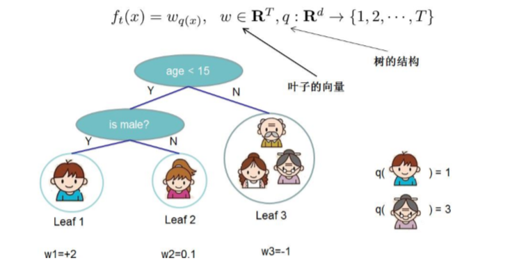 样本X落在叶结点q中,定义f为:ft(x)=wq(x),举例如下: