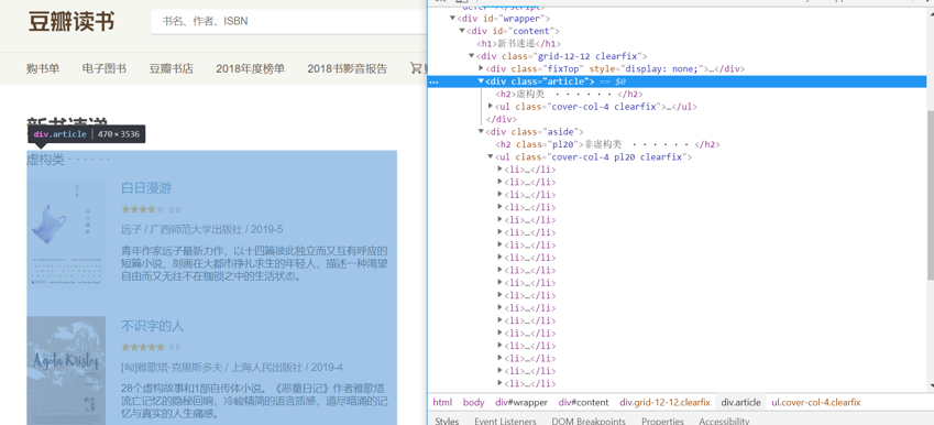 - 仔细观察可以发现 <div class="article"> 这一个标签目录包含了所有的虚构类图书信息;而对应的 <div class="aside"> 包含了所有非虚构类的图书信息。也就是我们只需要这两部分的内容,那我们按照标签提取它们。上代码。