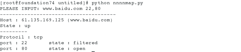 print ('port : %s\tstate : %s' %(port,nm[host][proto][port]['state']))测试: